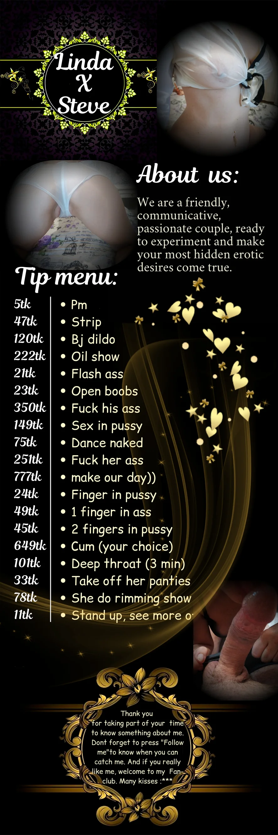 Our turn-on`s are spontaneous sexual ideas, suggestions, weird, kinky stuff, domination, dirty minded people